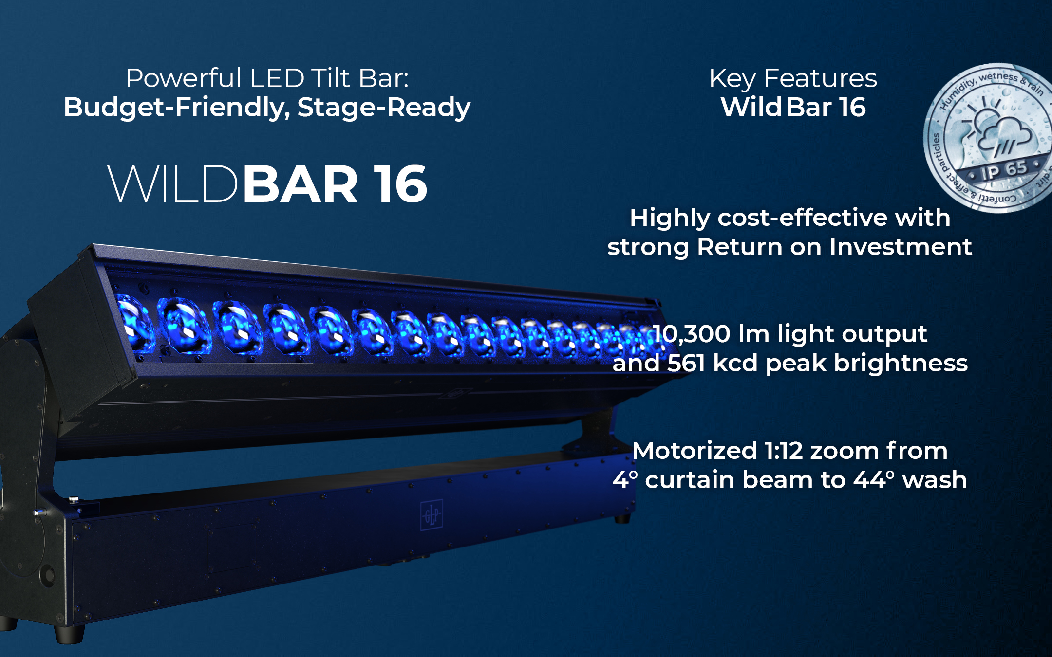 | | More bar. Less budget. | | | The new WildBar 16 brings GLP’s signature LED bar performance into a compact, lightweight, and budget-friendly design. Equipped with 16 × 40 W RGBL LEDs, 10,300 lumen output, motorized 200° tilt, and a 4°–44° zoom, it’s the ideal solution for outdoor and event setups where durability and quantity matter – without breaking the budget. | | |