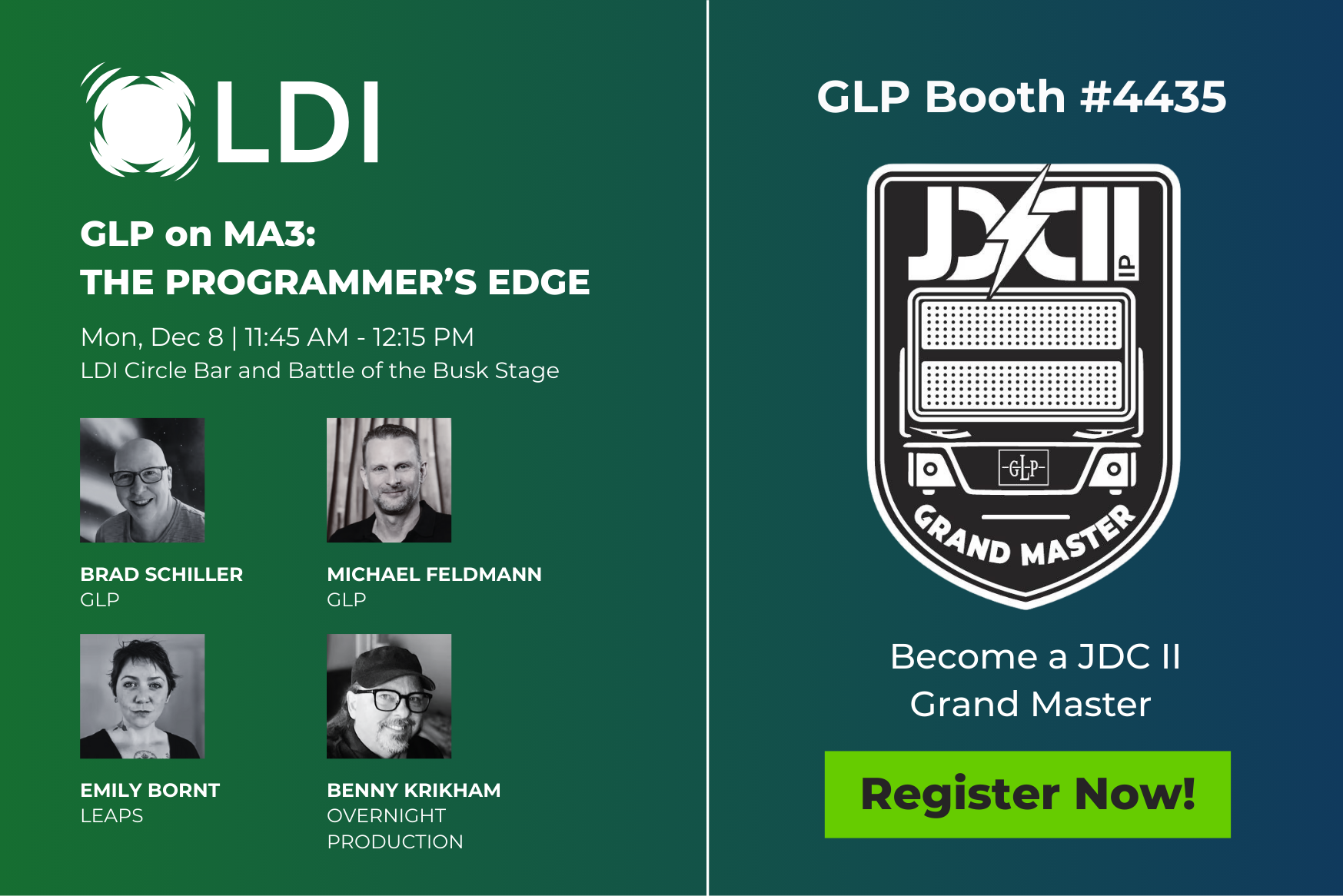 | | GLP @ LDI 2025: Exclusive Preview, Focused Training Sessions & a True Showstopper | | | At LDI 2025, GLP welcomes you at booth #4435 with the current product portfolio – and a spectacular special feature over 4 meters tall: the “JDC MAXX.” Curious? Come by and check it out! There will also be an exciting panel talk on “GLP on MA3” with Brad Schiller and several top programmers. A special highlight of the show is the JDC2 GrandMaster Training, offered multiple times per day: a compact 15-minute session right at the booth where you’ll learn how to efficiently program the JDC2 IP on a grandMA3 system. Save your spot now: | | | |